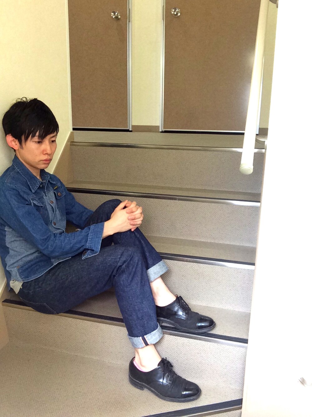 デニム×デニム 切り替えしのある古着のデニムシャツに濃色のデニムを合わせてグラデーションにしました。スニーカーだとラフになりすぎるのでブラックのシューズで締めています。