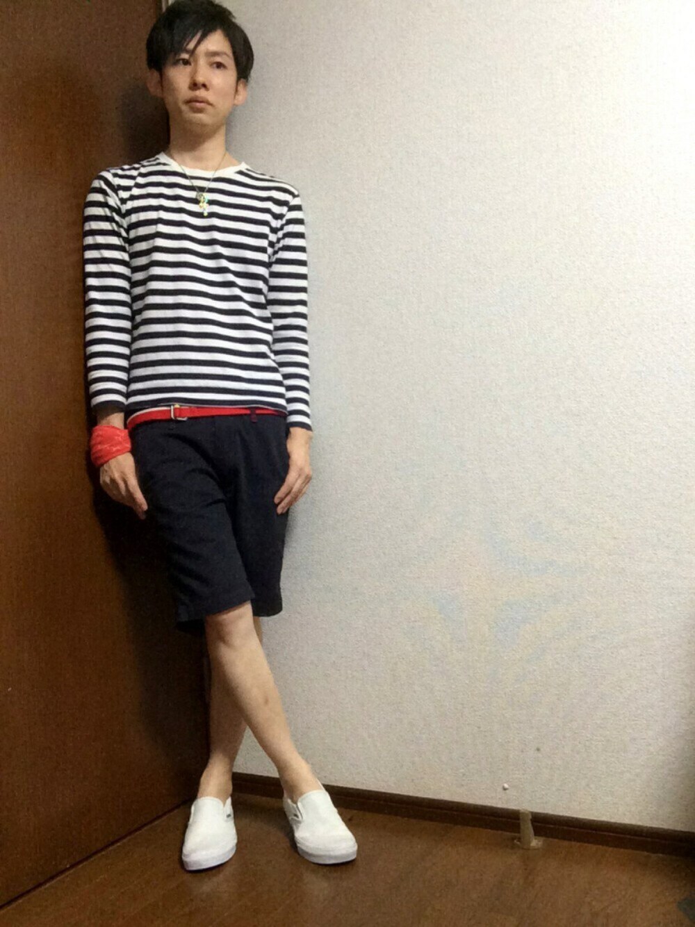 ご訪問ありがとうございますm(_ _)m✨✨ 今日は時期外れの大掃除だったので動きやすいシンプルなスタイルにしました🎵 白×ネイビーのボーダーのロンTは無印。アーバンリサーチのショーツはネイビーなので、赤を挿して好きなトリコロールでまとめました。 ベルトだけだとアクセントが足りなかったので、古着のリーバイスのバンダナをリストに巻きつけてポイントにしています。