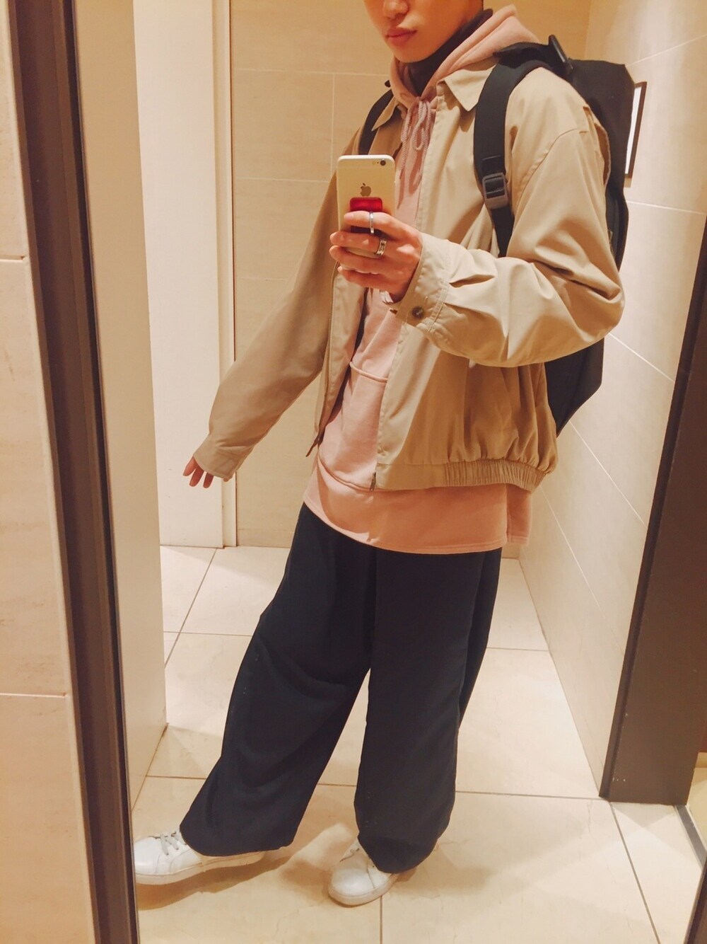 ピンク色のパーカー使ってコーディネートです。 春も近づいているので、明るい色で春っぽさを出してみました。