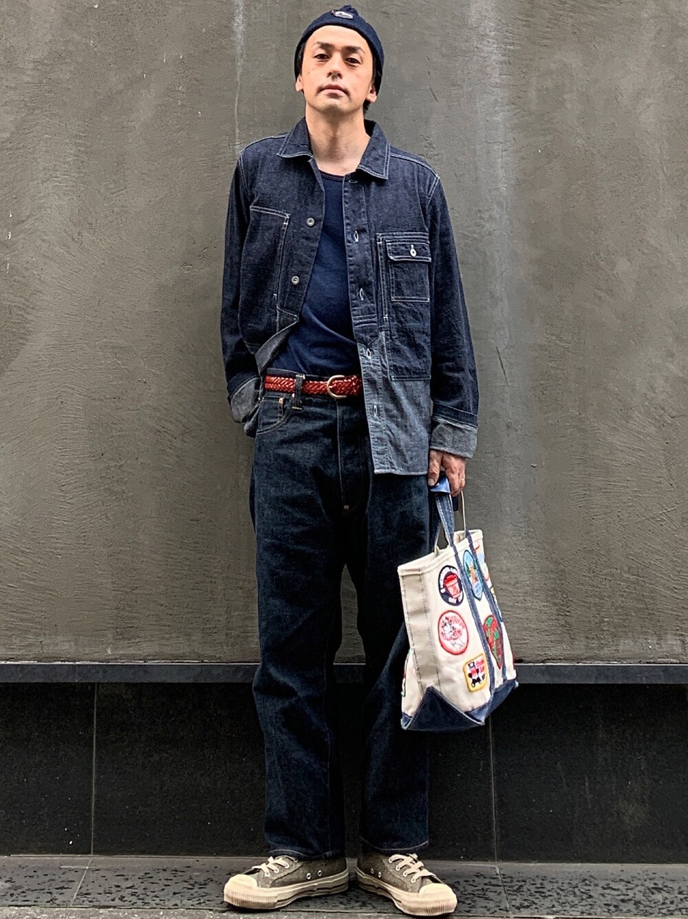 こんばんは。 今日もデニムベースの梅雨の日コーデ。 蒸し蒸しするし、寒くもなるので、 温度調節用のシャツは重宝しますよね。 ジャケット代わりのNigel.Cのユーティリティシャツに、 刺し色にEvisuの赤ベルトでカッコつけました! 素敵な夜を。
