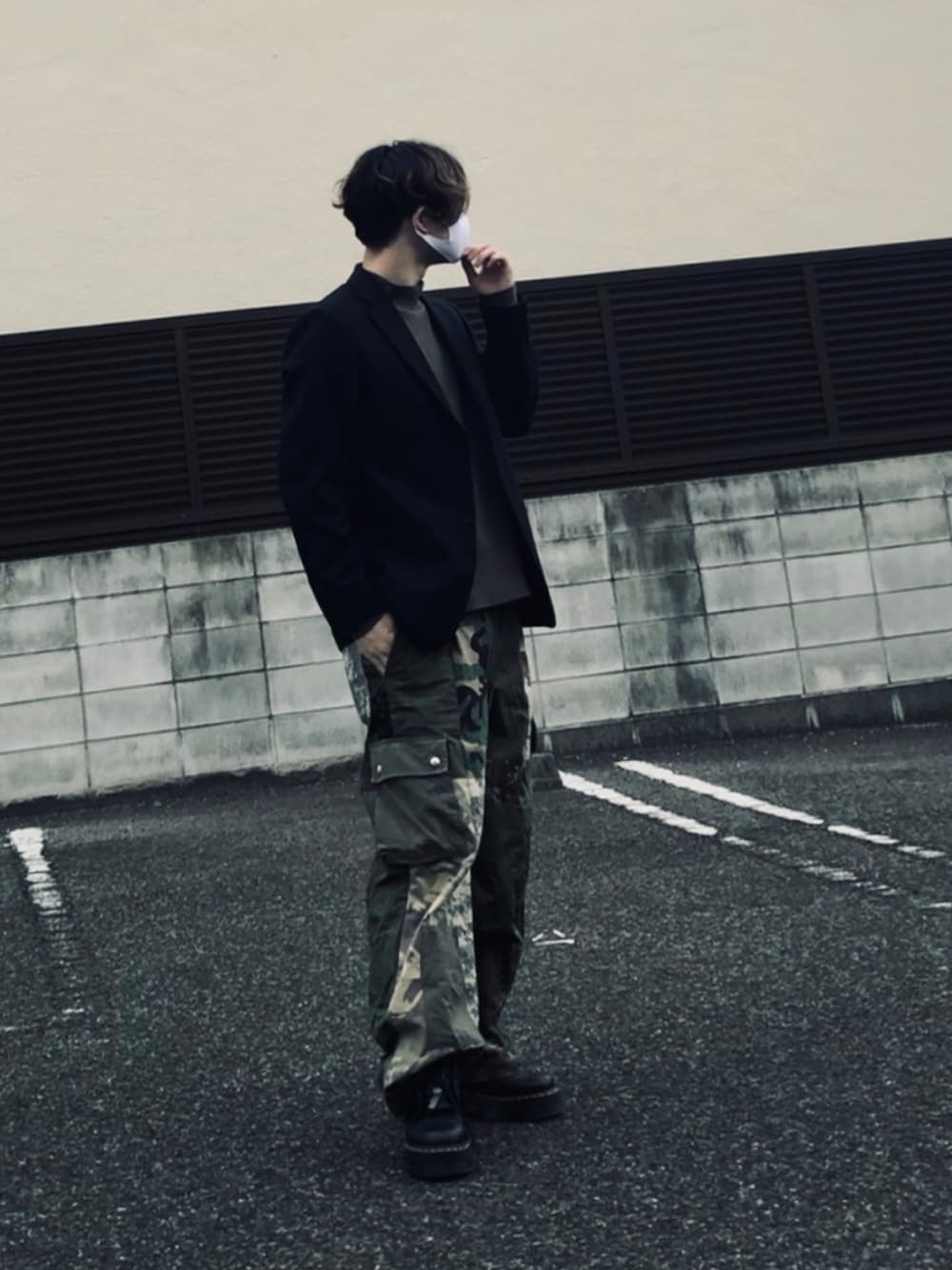 ジャケットに迷彩のカーゴパンツを合わせてみました。+jのジャケットがかなり綺麗な形なのでパンツでカジュアルダウンできたか怪しいところです