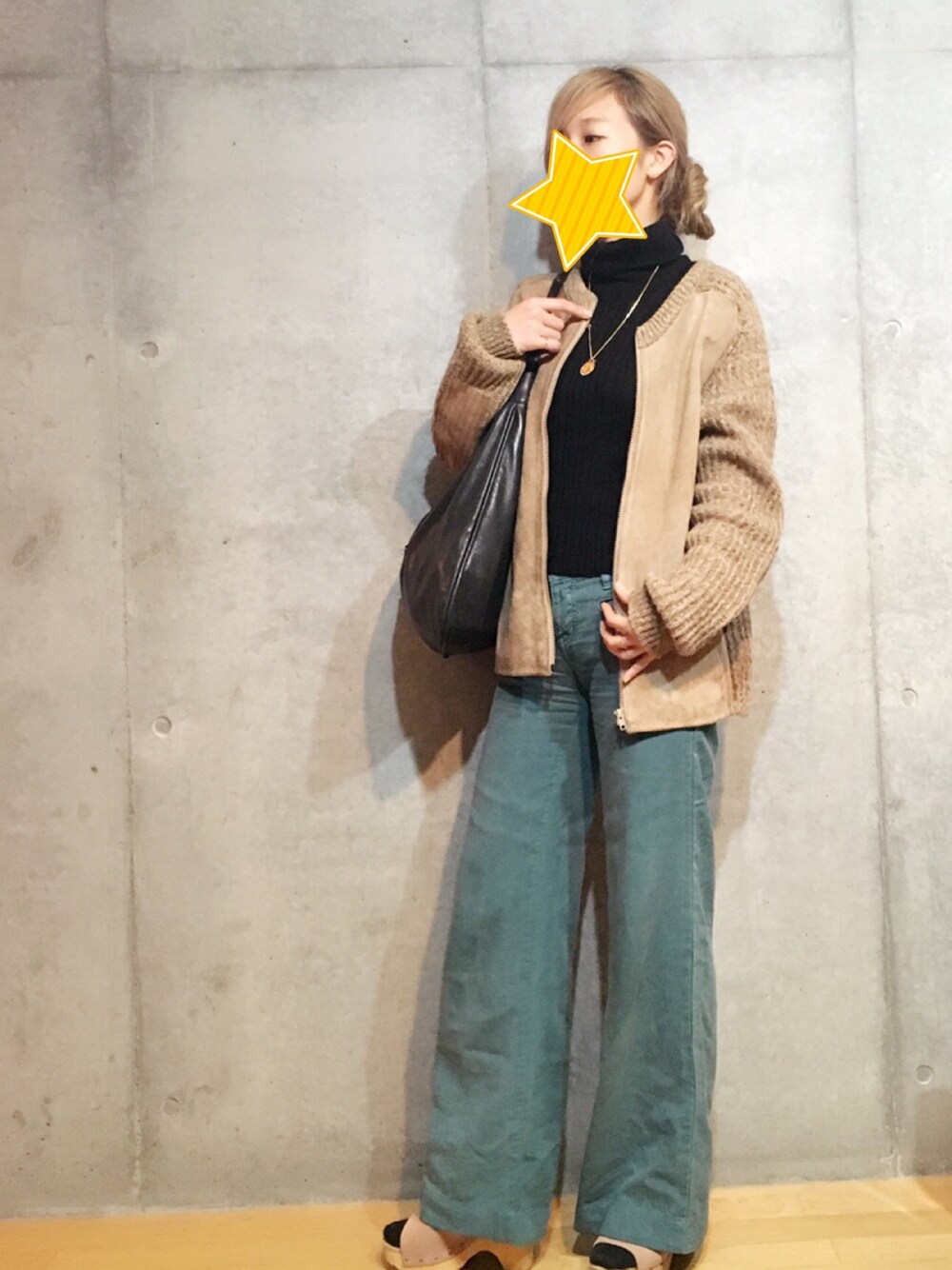 このパンツの色がおきにいりっ🌿 アウターのスエードとニットの素材違いなところもお気に入りです✌︎💓