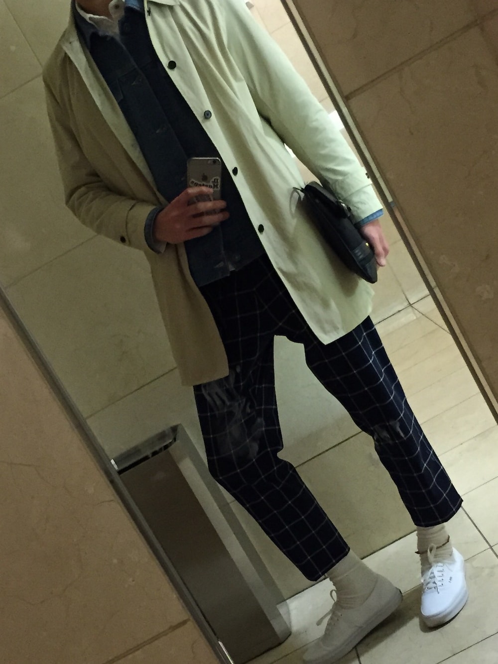 春を意識した明るめトーンのコーデです。 ベージュのスプリングコートであるステンカラーの中にウームのNIRVANAジョグデニムGジャン。 パンツは417のウインドウペンのクロップドで白ソックスにオールホワイトのバンズを合わせました。 この春は足元は軽快に白でいきたいですね。 ウインドウペンのパンツは個人的にすごく気に入っています。 初夏まで履けそうです。 417のホワイトバンズは最近SK8-Hiも購入しました。 春の足元はとにかく白でいきます笑