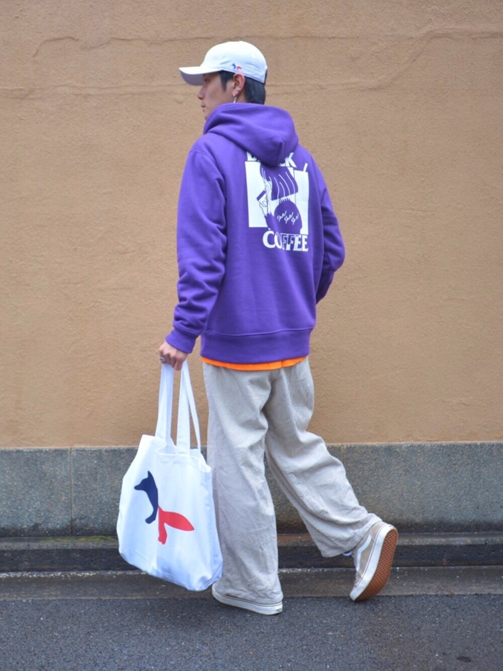 白メインに紫を持ってきました。 バックプリントというのもあり 今回はアウターを着ることなく 過ごせる用にしてみました。 そして下から見えるオレンジの差し色を入れ一つ違う所を加えて、、、