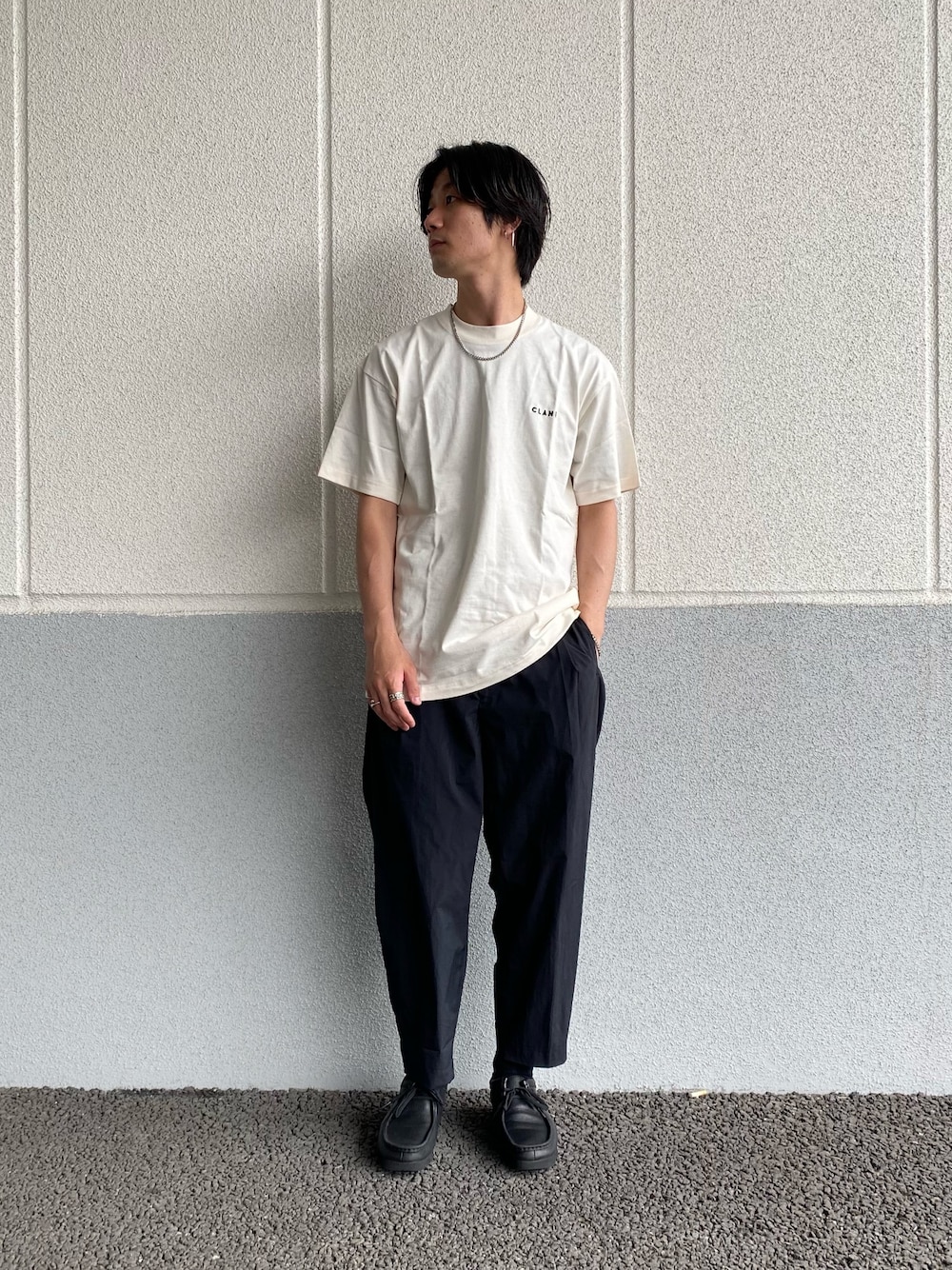 ●年齢:30代前半 ●身長:176cm ●普段サイズ:トップスL/ボトムスM/シューズ27cm ㅤㅤㅤㅤㅤㅤㅤㅤㅤㅤㅤㅤㅤ 5周年記念のCLANEのTシャツを着用。