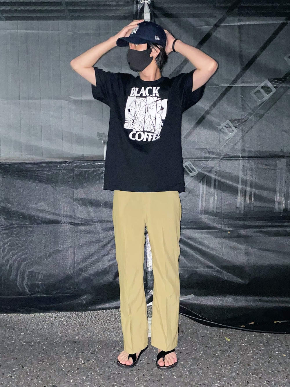 ロゴTをカラーパンツと合わせて黒でまとめております