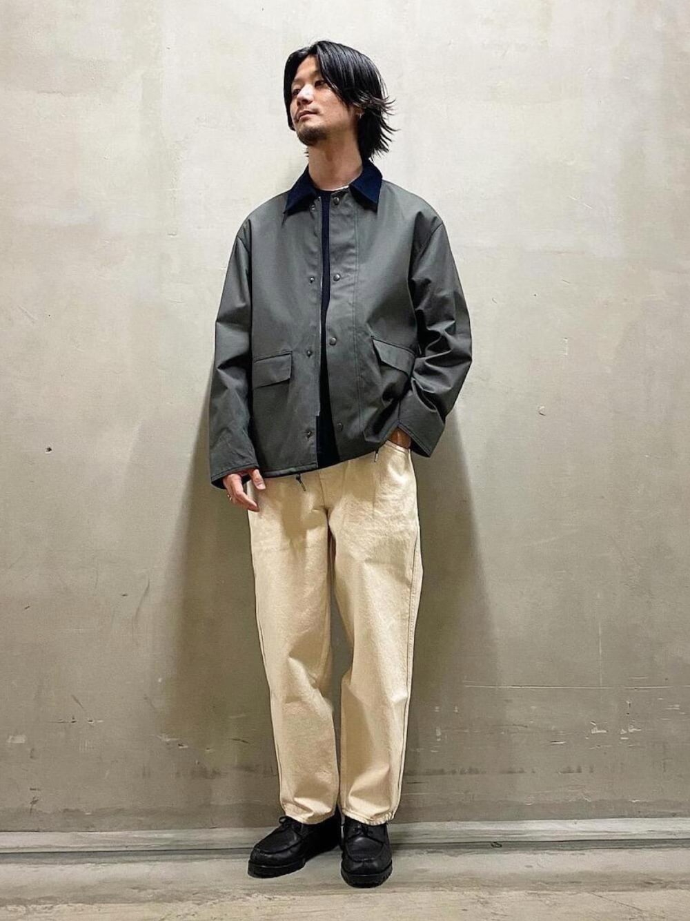 ●年齢:30代前半 ●身長:176cm ●普段サイズ:トップスL/ボトムスM 【サイズ感】 トップス: 適度にゆとりを持たせた丸みのあるシルエット ボトムス:バルーンシルエット 【素材感】 トップス:本体コットン100%・内側上部ポリエステル100%・下部ポリエステル84%・コットン16% ボトムス:コットン100% 【コーディネートポイント】 色の組み合わせを落ち着いた色にする事で大人っぽい服装に仕上がるように考えました。暗さのある色でまとめるとどんよりとしたコーディネートになるのでオフホワイトのバルーンシルエットデニムを合わせております。足元は革靴にする事でカジュアルなスタイリングも綺麗めに変わります。新しい作りのフレンチシリーズのボートシューズを選びました。