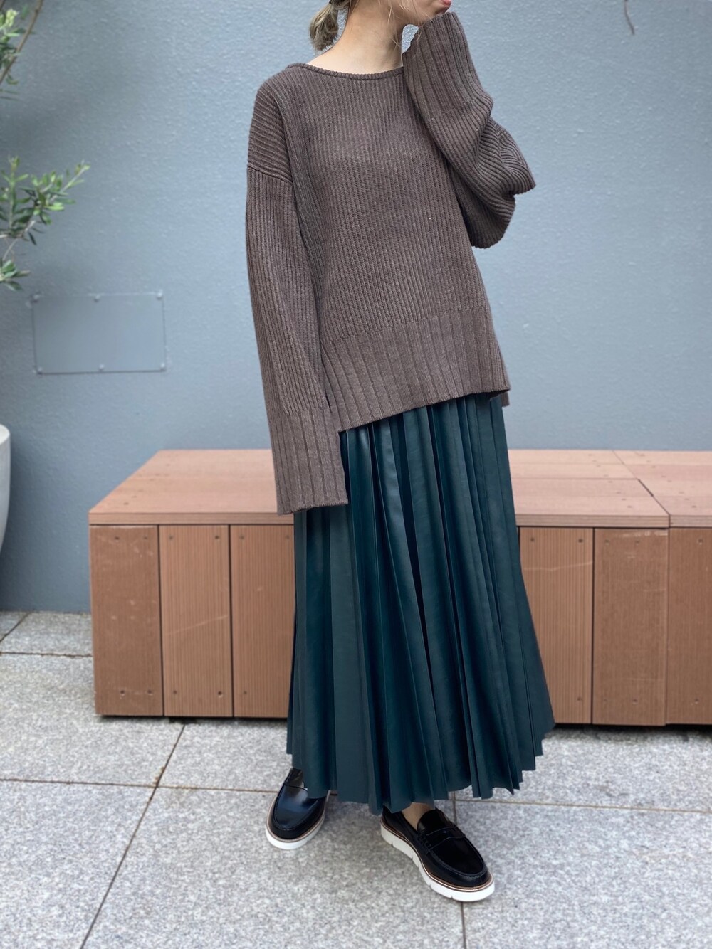 ゆったりした袖が特徴のニット。 たっぷりした袖が個人的におすすめです! また、フェイクレザー素材のスカートは プリーツなので程よいボリューム感で 合わせて頂きやすいですよ^^ フェイクレザーのアイテムは この秋からは特にオススメのアイテムです!