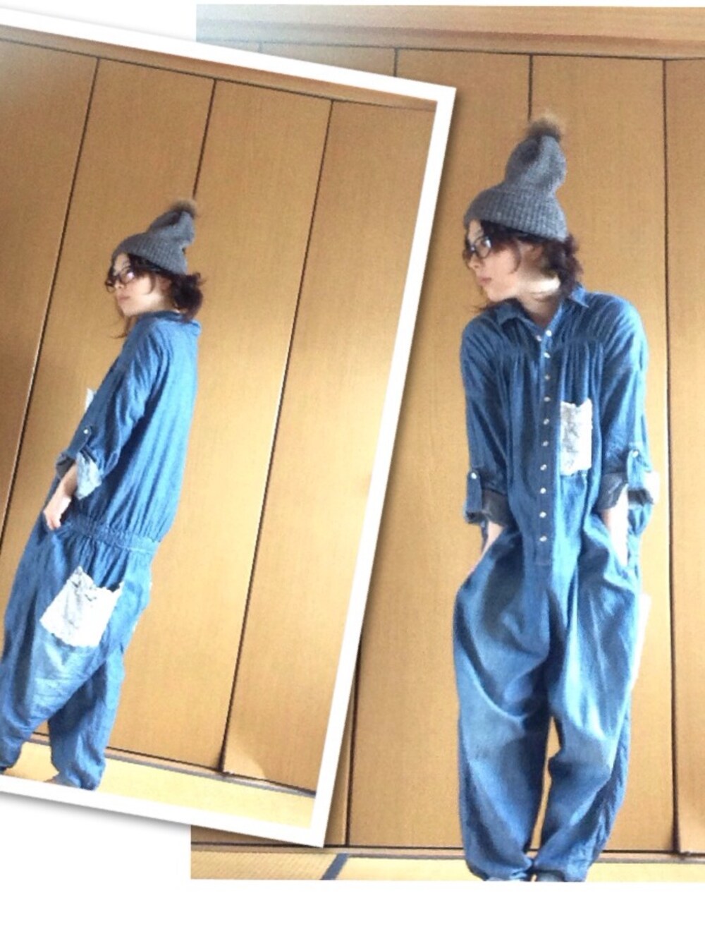 つなぎコーデでリラックス。 つなぎってお腹冷えるから、腹巻きは 必須。
