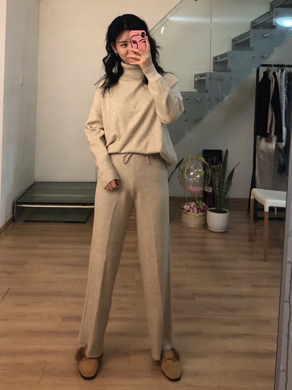 ベージュ系のニット/セーターを着用したレディースの冬コーディネートの1枚目の写真