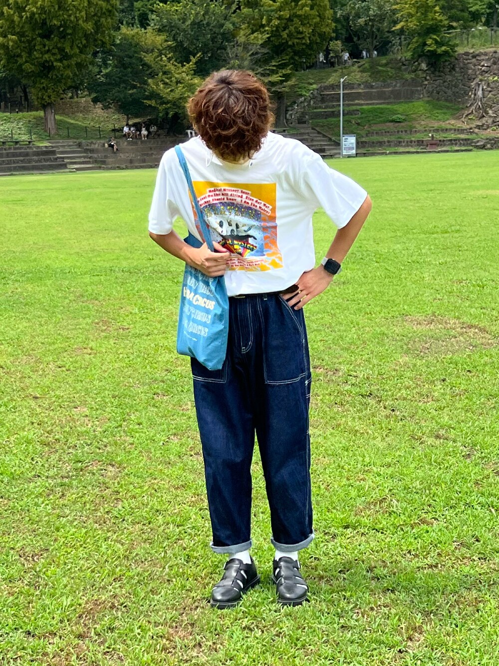 ビートルズTで王道Tシャツデニムコーデ ビートルズのデザインが入ったTシャツでシンプルになりすぎないように。 タックインすることによって今風に、カジュアルになりすぎないように。