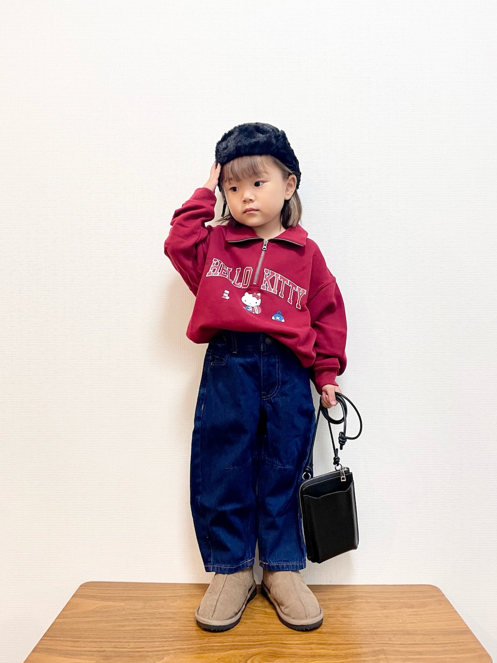☑︎ Tops サンリオキャラクターズ スウェットハーフジップシャツ 17 RED / 110cm 着用 ☑︎ Bottoms バレルレッグジーンズ 67 BLUE / 100cm 着用 身長 98cm 👧🏻