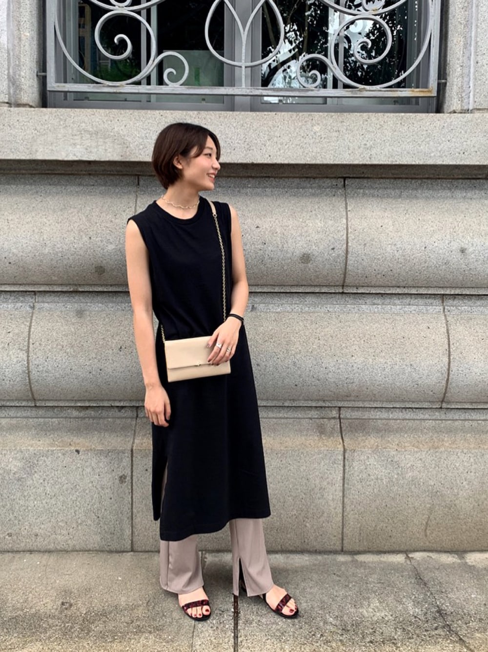 値段はプチプラ。小物はagnes b.で揃えました。 神戸の街をイメージしたコーディネート。 シンプル過ぎずべっ甲のサンダルで高見えに 素材はカジュアルなUSAコットンワンピース。