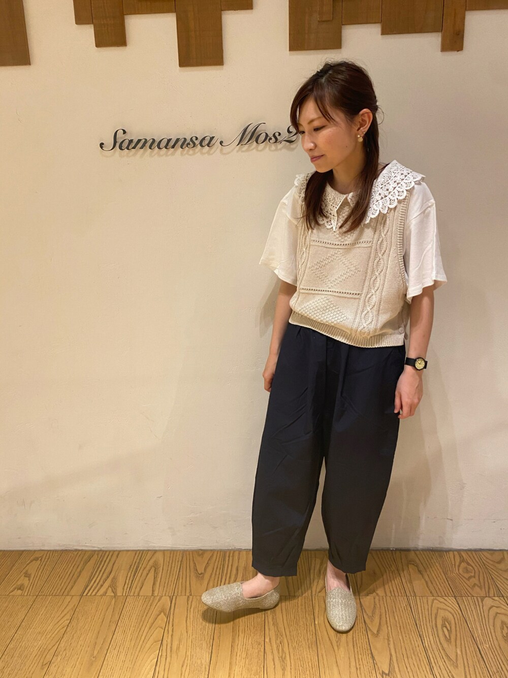 大きめの衿レースとゆったりパンツコーデ このパンツはバルーンやサルエルがお好きな方にぜひ履いていただきたい1枚です✨