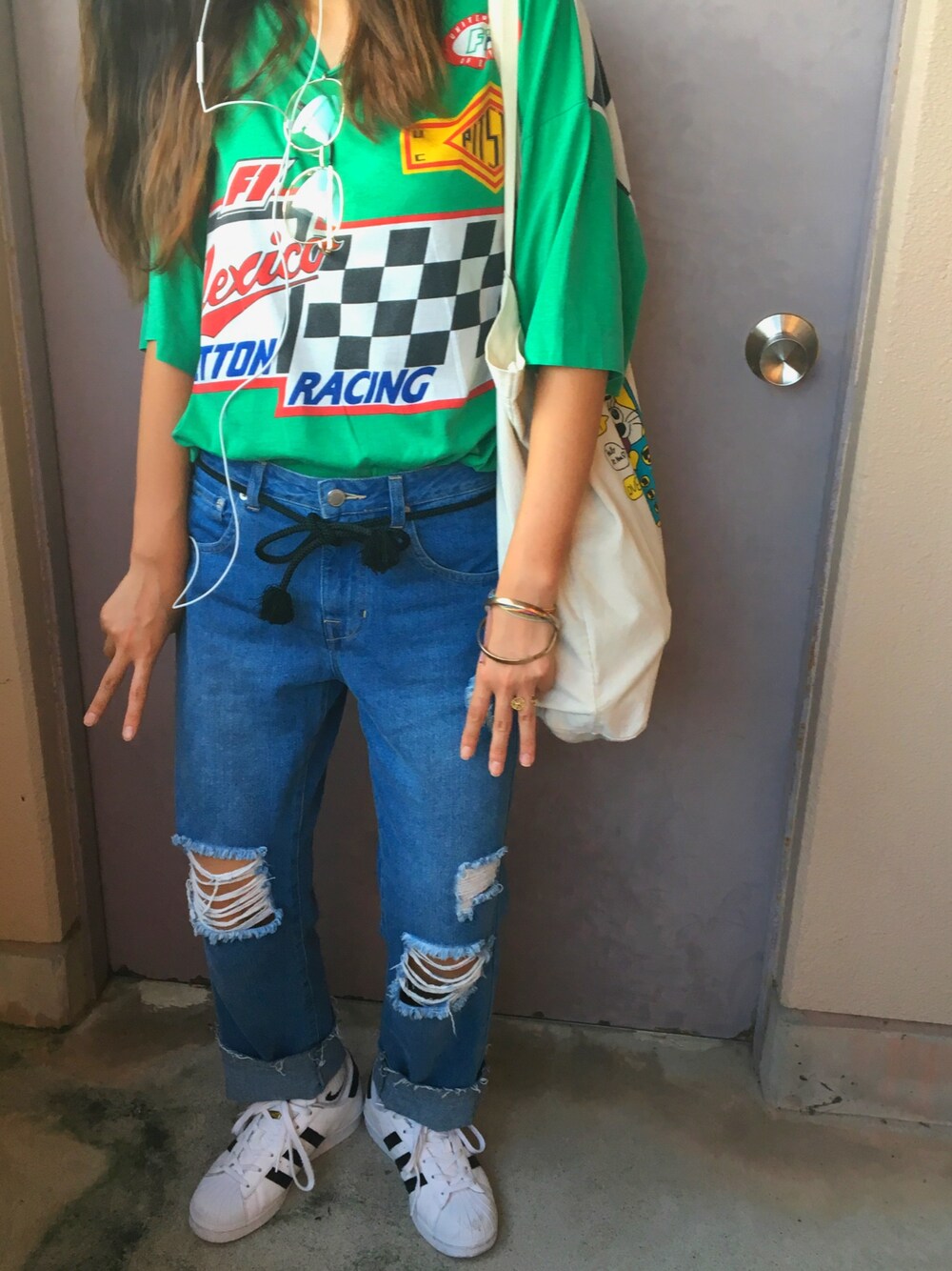 上のTシャツは古着屋さんで1500円 デニムパンツは安くなって1500円 プチプラコーデ🐢🐢🐢