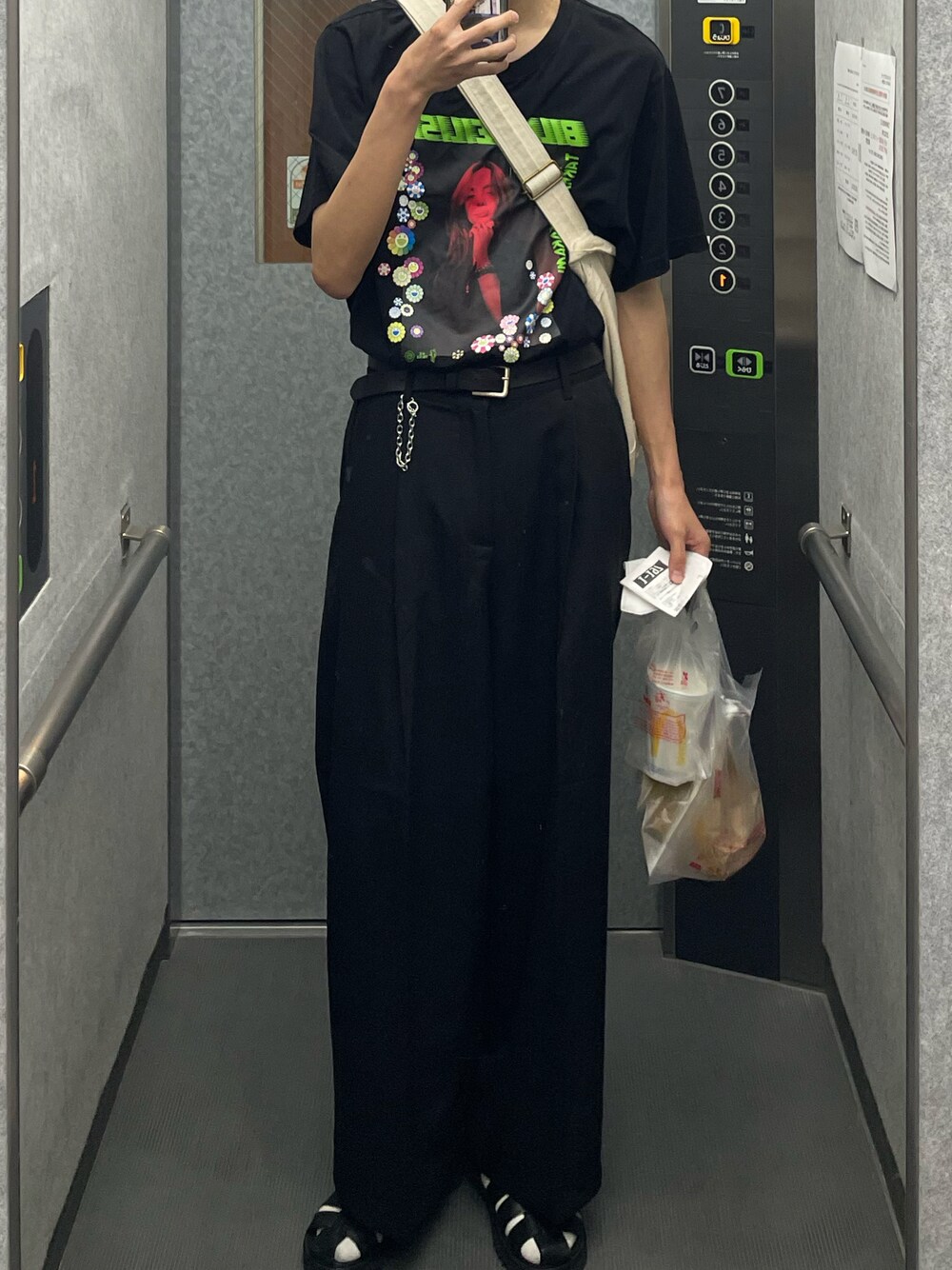 全身ブラックコーデ! グラフィック黒TシャツにEMMACLOTHのスラックス合わせました!