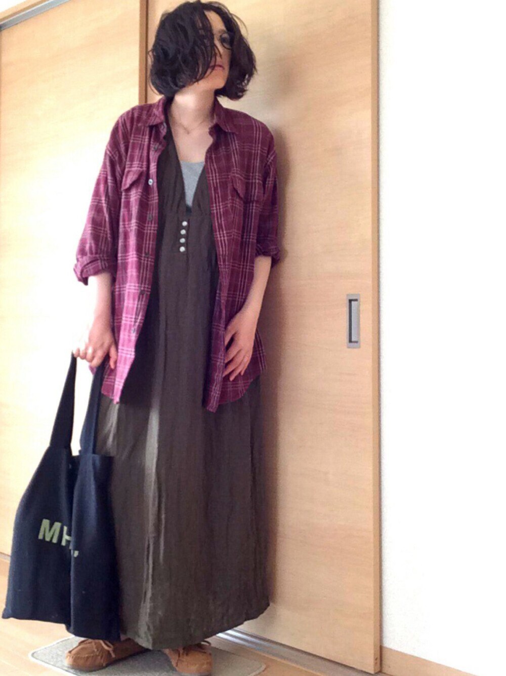 妊娠7ヶ月コーデ。 チェックシャツは着まわし出来てヘビロテです(^ω^) カーキのワンピースはゆるっと着られてお腹も締め付けない!