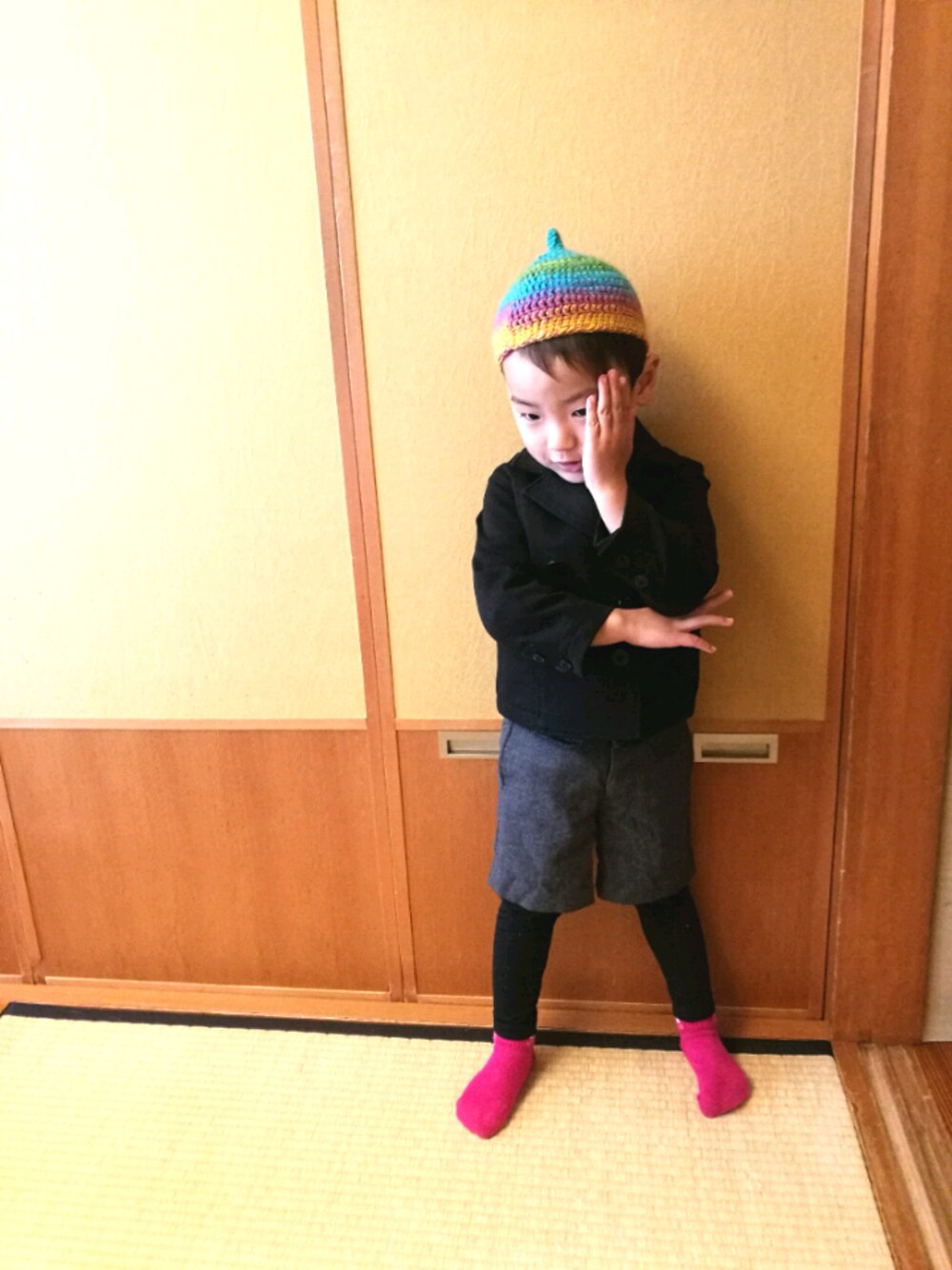 帽子は手作りです。 カラフルどんぐり帽子とビビットカラーの靴下でフォーマルにカジュアル感をプラスしました。