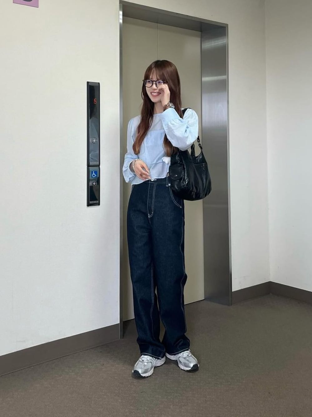 ブルー系のデニムパンツ、ブルー系のシャツ/ブラウス、ブラウン系のメガネを着用したレディースの春コーディネートの1枚目の写真