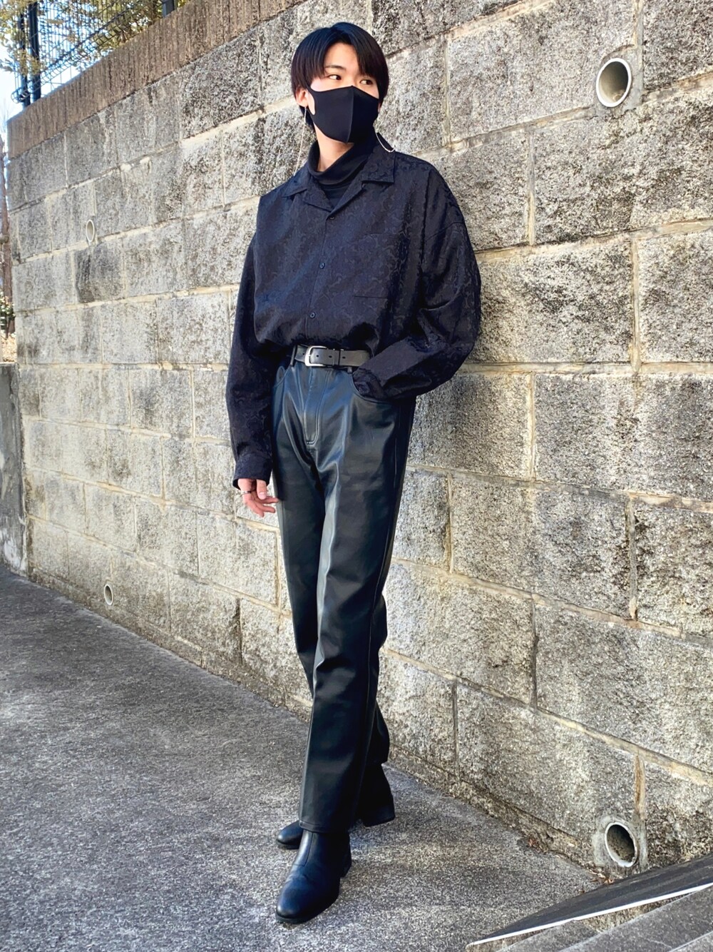 ご覧いただきありがとうございます! ・開襟シャツとタートルネックを合わせてタックインしたオールブラック韓国風コーデ