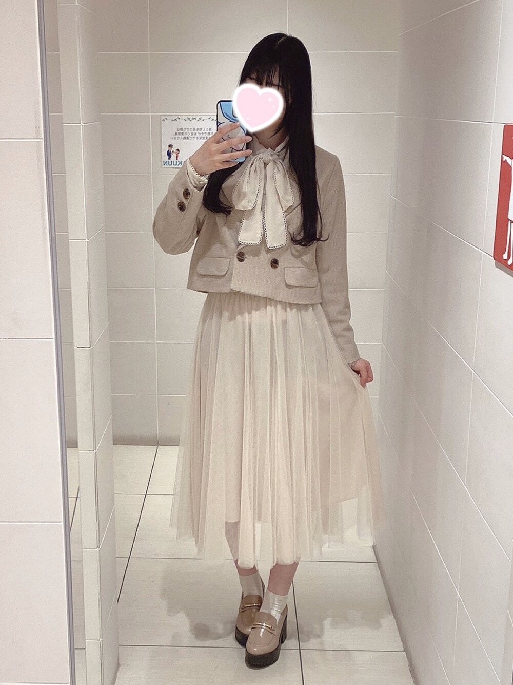 きょうのふく🧏🏻♀️🧸 ふわふわ淡色コーデ⺣̤̬♥ ショートジャケットにチュールスカートで甘辛MIXしたよ〜ボウタイブラウスのリボンも大きくてお気に入り(◍˃ ᵕ ˂◍)