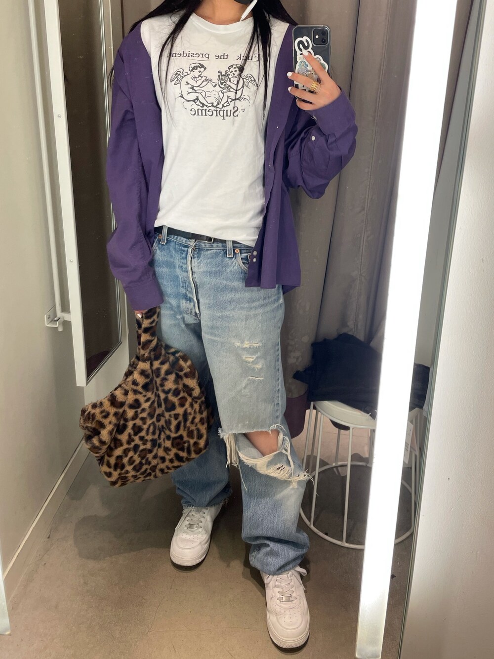 ホワイト系のTシャツ/カットソーを着用したレディースの春コーディネートの1枚目の写真