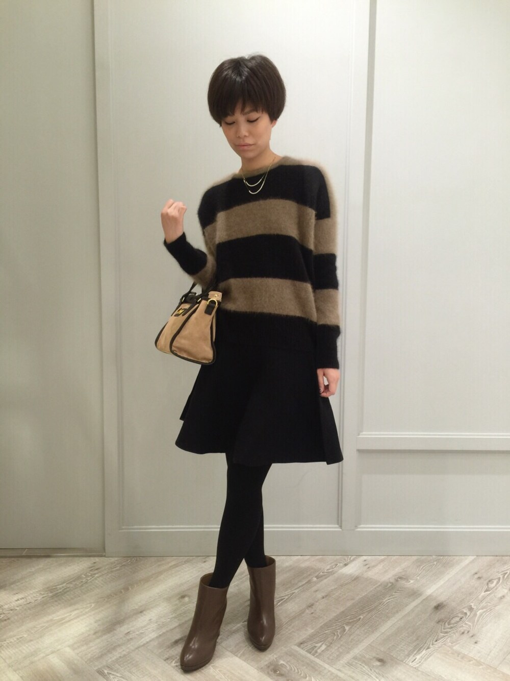 ふわふわで暖かいフェレット素材の上質なニットとラインが可愛いスカートのコーデ。 ボーダーでカジュアルダウンしているので、甘めのスカートコーデが苦手な方にもオススメです☆