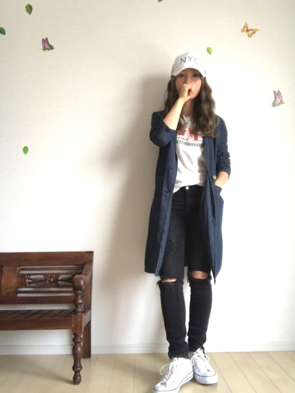 スニーカー × キャップ 最近ハマってます。 このデニムのチェスターコートは カタチが綺麗でちょっと羽織るには丁度いい✨ みなさん、いつも ありがとうございます☺︎♡