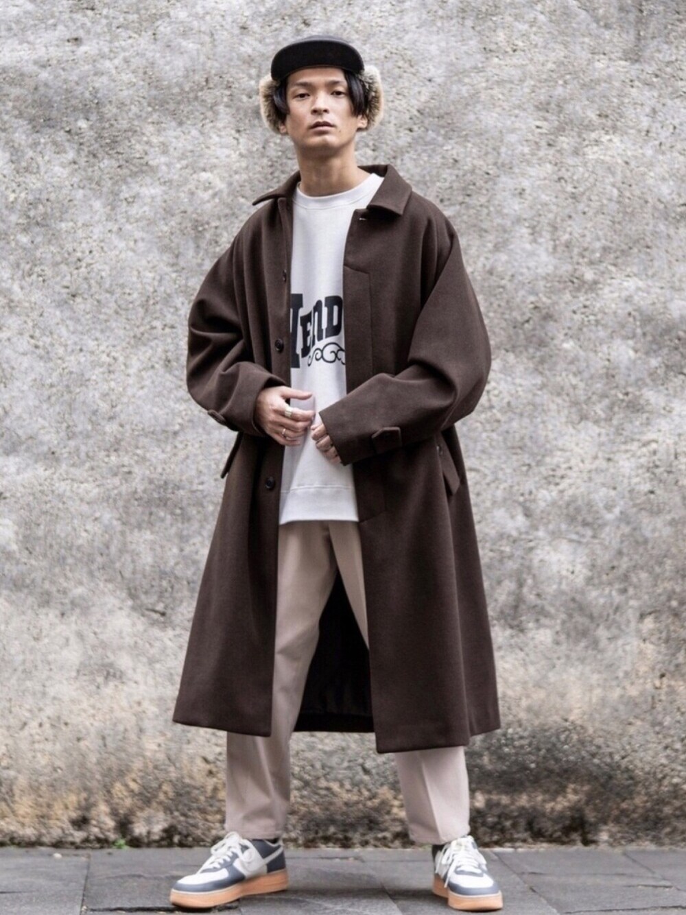 #マイベストコーデ2020 今年一番気に入っているコーディネートをもう一度投稿! ⬛︎コーディネートポイント ブラウン、ベージュ、ホワイトの3色コーデ。明るい色がくすみカラーなので、全体的に落ち着いた印象に。 キレイ目なパンツとコートを、インパクトのあるビッグプリントのスウェットと、厚底のガムソールスニーカー、フライトキャップでカジュアルMIXさせてます。 個人的には、ここ最近のコーディネートで一番好き! ぜひ全身マネして欲しい(笑) ⬛︎コートのお気に入りポイント ドルマンでビッグシルエットだから、羽織っただけで腕周りや背中にドレープが溜り、簡単にオシャレな雰囲気を出してくれるアイテムです。 生地は、ウールを使っていないので、チクチクせず柔らかく軽量で着心地が良いからストレスなく楽に着られます。 ⬛︎着用サイズ(身長174cm) ・コート → Lサイズ ・スウェット → Lサイズ ・パンツ → Mサイズ 詳しくは商品をタップしてご覧ください。 ________________________________ この投稿が少しでも参考になったと思ったら、ぜひ【いいね】を。違うコーデも見たいと思った方は【フォロー】をお願いします♪⠀ ⠀ あと、個人のInstagramもやってます。 WEARにアップしてない写真や、私服コーデなどを投稿してるので @kure_wear で、ぜひ検索してみてください! ________________________________