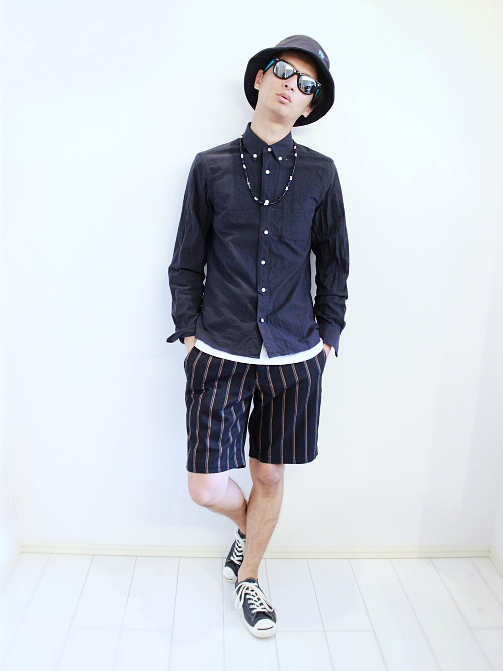 『ネイビーストリート』 サングラスとバケットハット、ビーズネックレスでストリートを表現。 オールネイビーだからちょっとキレイめに見えるかな?? パンツとシューズは昨日投稿したものと同じです。 合わせるものでこんな感じに変わります✨ またしても小窓はネタ。 写真を見返してる時に、ふと「グランフロント店のサブ店長のmasachikaっぽいなぁ〜」って思ったもので、身内ネタですがよかったら見てみてください(笑)