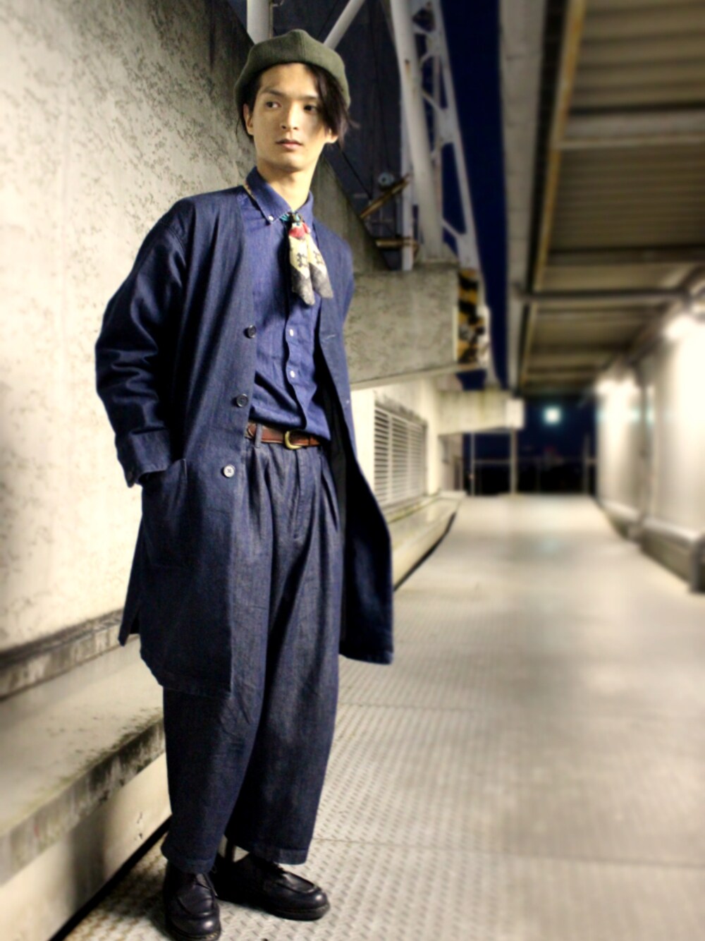 『オールデニム。』 おはようございます。 今日の大阪は曇りのち晴れ。 爆弾低気圧で昨日は大雨でしたが、なんとかもちかえしてよかったです。 さて、今日は大阪でロケ撮影。 たぶん心斎橋あたりでするとは思うんですが、とりあえず集合場所であるグランフロント大阪に向かってるとこです。 ちなみに昨日も東京でカタログ撮影。 なんだか店頭に立たなくても仕事になるのが不思議です。 僕にとっては大好きなことなんで、楽しいですしありがたくて仕方ないですけど(笑) さて、コーディネートの話。 fuzeeさん影響で久しぶりにハンチングをかぶってみました。 このハンチングを買った時はイギリスの新聞配達員みたいな雰囲気で使っていたので、ちょっとその感じが残ってる…?いや、そんなことない? まぁ、デニムシャツをデニムガウチョにインしてデニムコートを羽織るというオールデニムコーデに、久しぶりに使ったバーニーズのベルトとパラブーツで重たく渋くしてみました。 HAV-A-HANKのバンダナをネクタイみたいに通してリングでとめてアクセントにしてるんですが、やっぱりちょっと付け足しちゃうのが好きなんですよね(笑) 今の若い子はそういう付け足し無しにシンプルに着こなしてるから、そういうのも吸収していきたいんだけどねぇ〜 でも付け足しちゃうんだろうなぁ〜(笑)