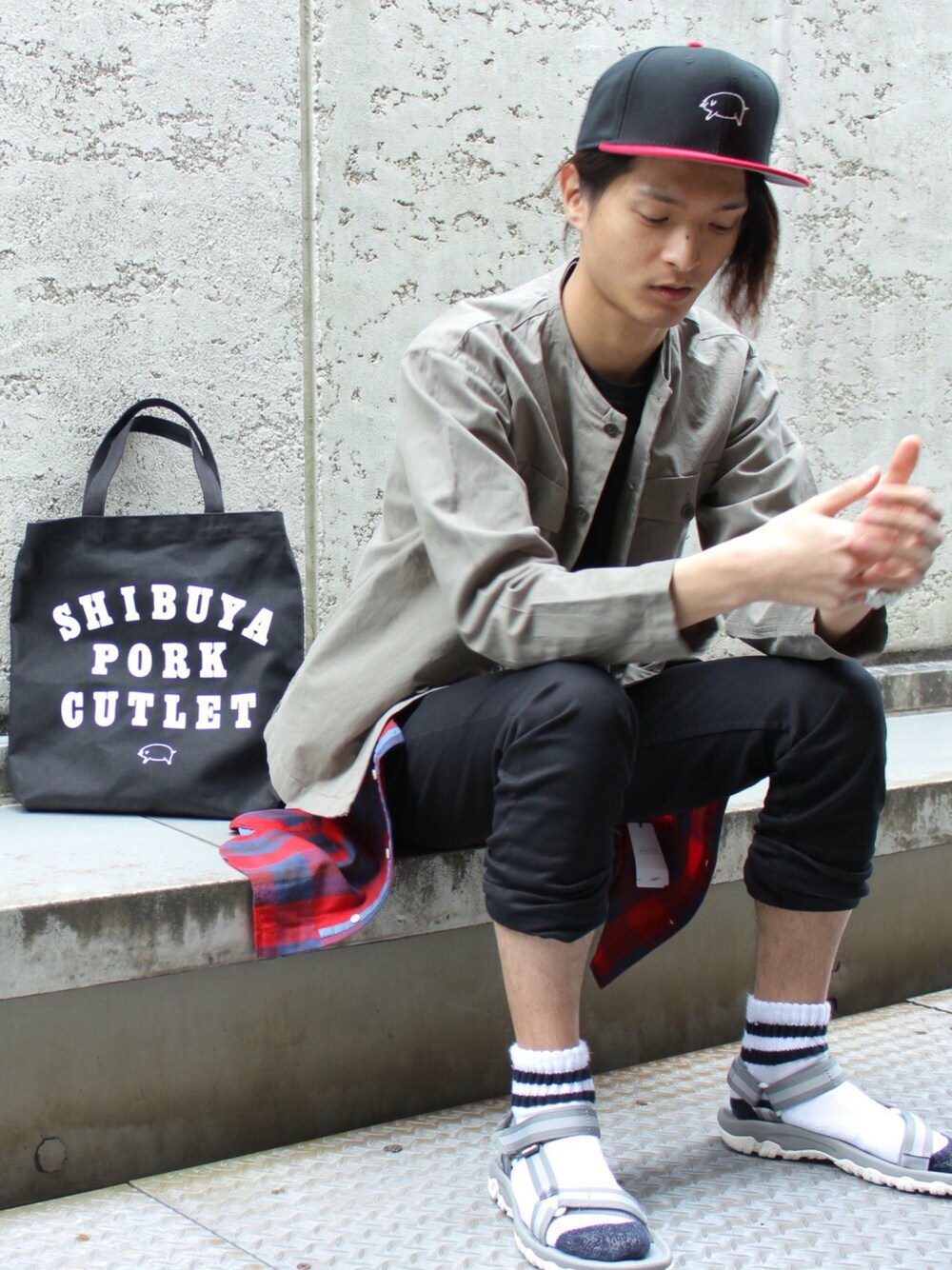 KURE.のキャップ「とんかつDJアゲ太郎×JUNRed OTTOベースボールキャップ」を使ったコーディネート