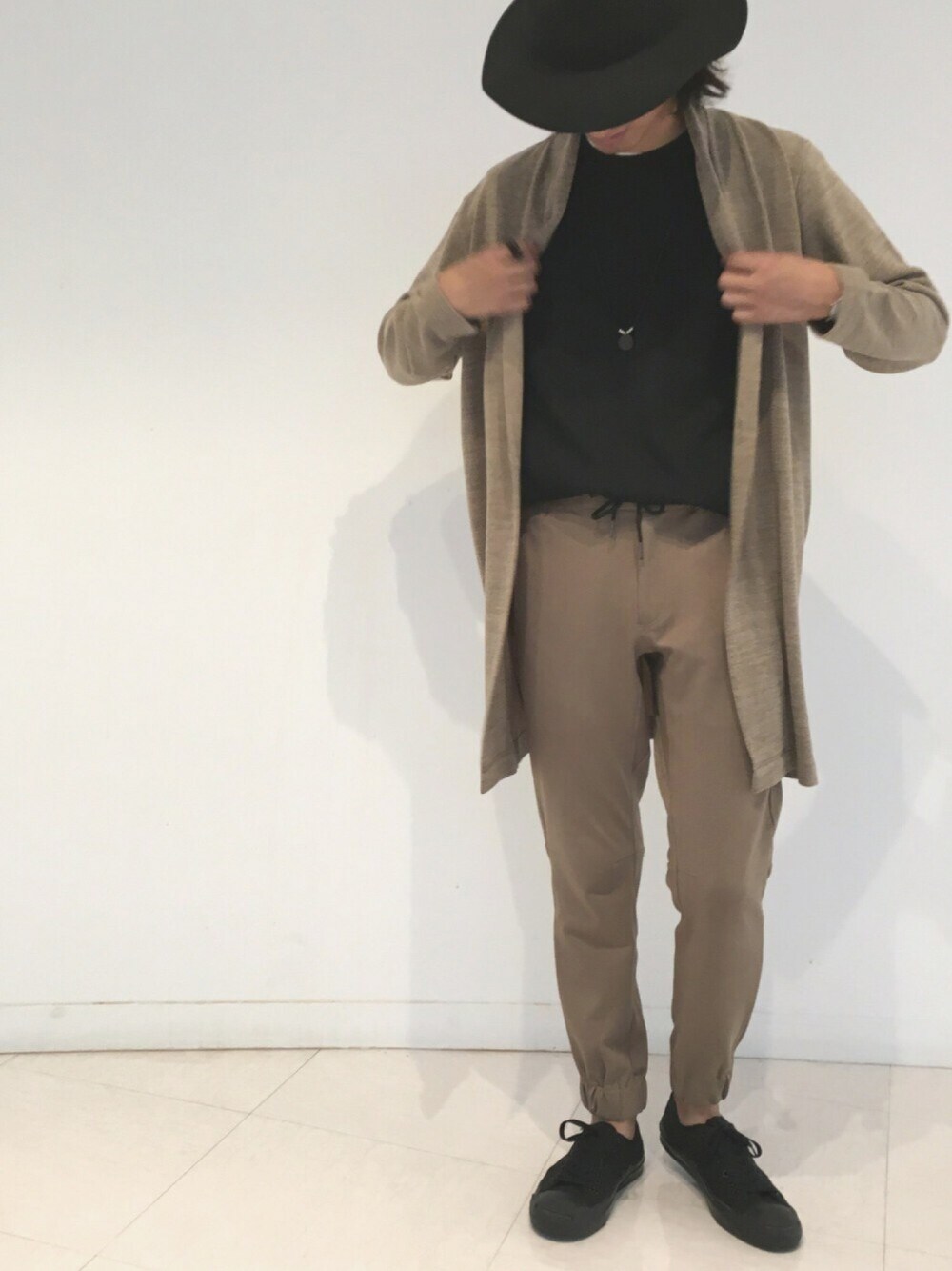 『ブラック×アースカラー』 今年らしい色合いのベージュを使ったコーデ。 アースカラーはアースカラーでも気分的にはカーキより、ブラウンかベージュ。テラコッタなんてのも良い。 で、トレンドのジョガーパンツにタックインしてスポーティーなところに、コーディガンとハットでバランスをとってます。