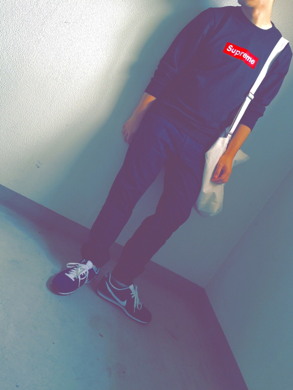 この靴を見せるために変な立ち方しました笑笑 あとSupremeのやつ!あとこのバッグは韓国で買ってきました〜✨