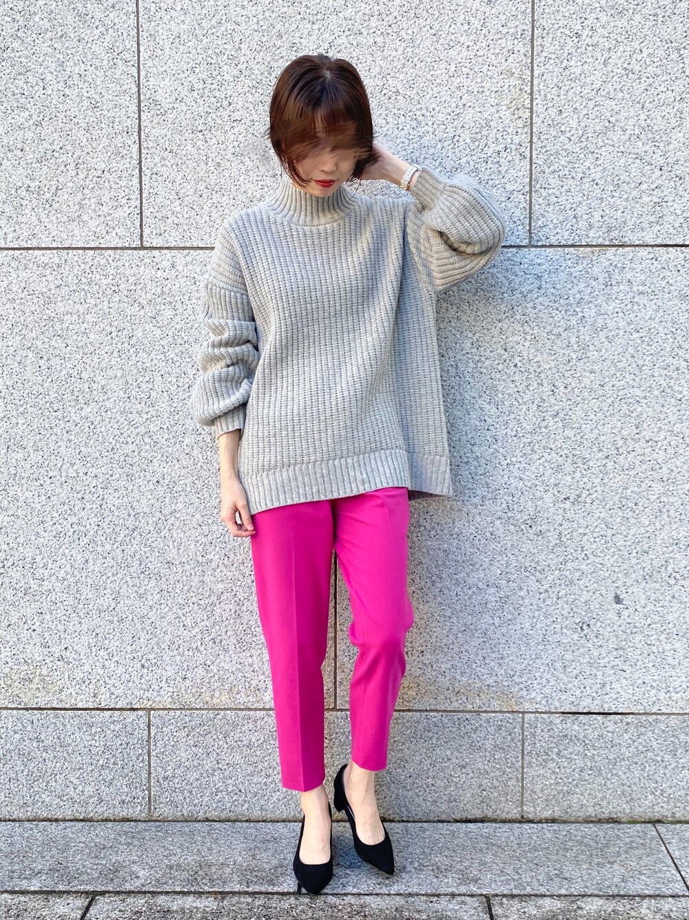 見てくださりありがとうございます😢 フォロー喜びます😊 ピンクのカラーパンツ! ビビットカラーなので目を惹きますー! 有彩色であるピンクに、無彩色のグレーを合わせた大人カジュアルコーデです♪ パンツストレッチが効いていて、とにかく楽ちんに履けます! 屈伸めちゃくちゃ出来ます!🤣 ニットはお気に入りのざっくりビックシルエットニット🧶 袖のボリュームがかわいい🥺
