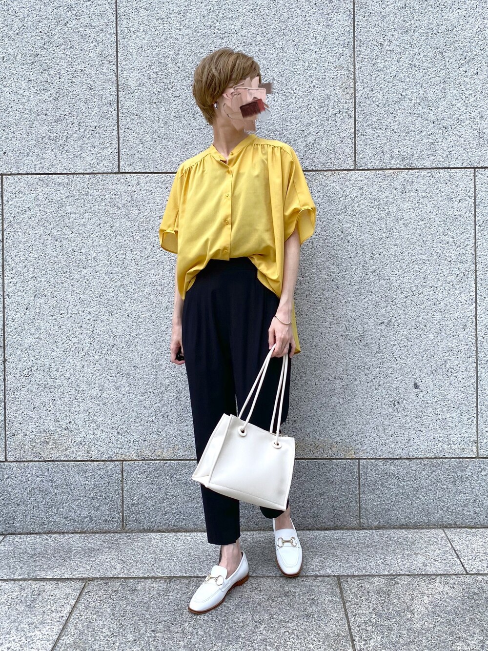おはようございます☀ 春夏らしいイエローのトップスをポイントに💛 ギャザーのデザインが可愛い🥺
