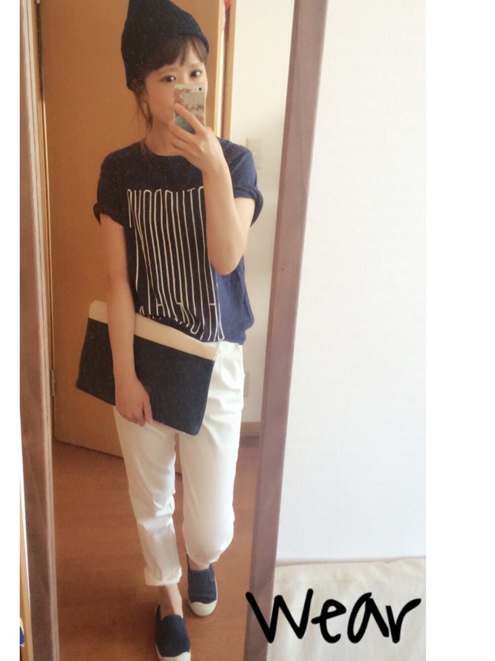 ホワイトパンツをどうしてもはきたくて。 ホワイト×ネイビーの楽ちんコーデ♡ Tシャツは大きめを着るのが良いですね♡ 本日もサタデーズです♪♪ 袖も裾もクルクル♡ 北海道夏がやってきたー😂