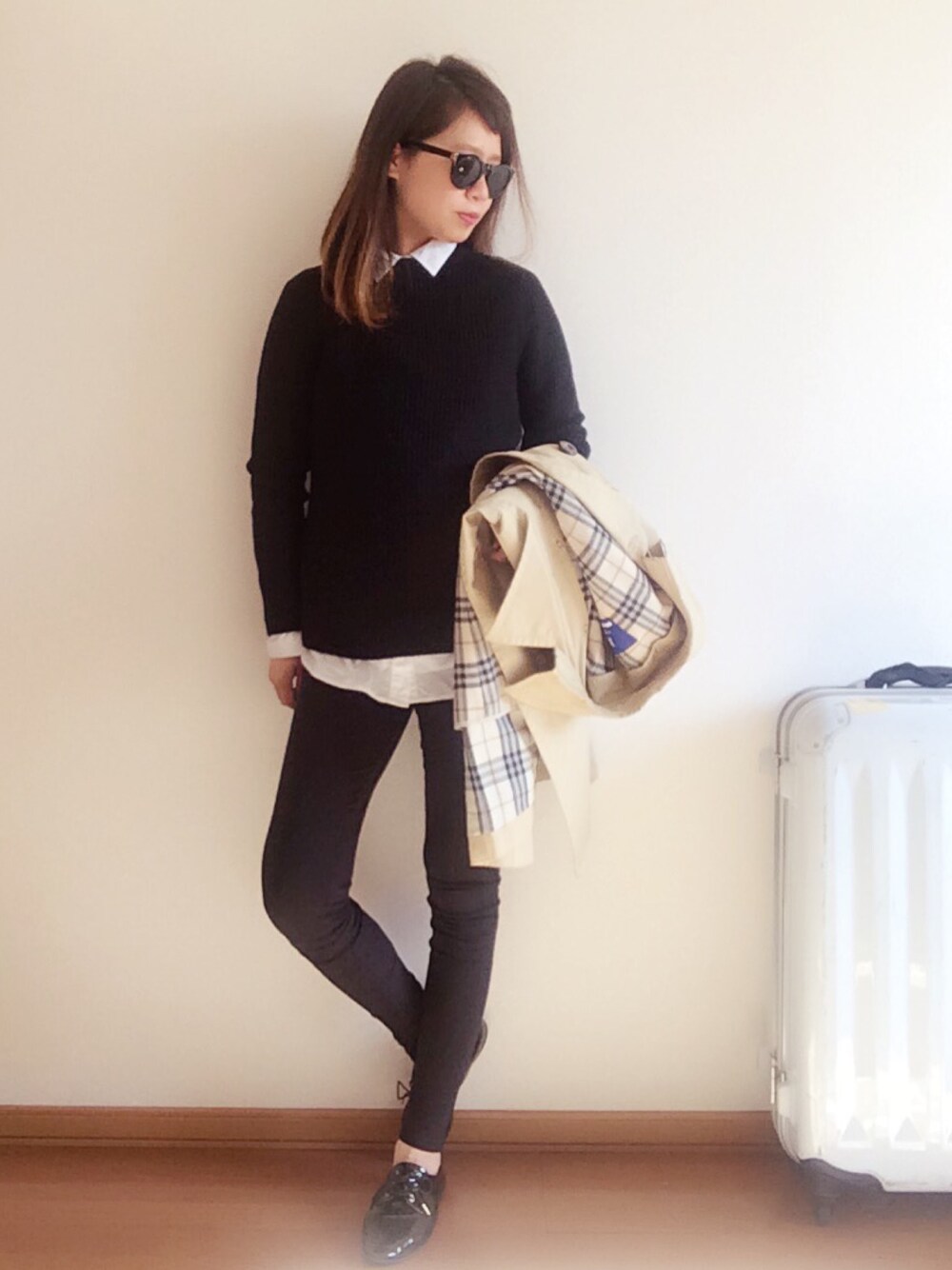 ブラックとロング白シャツ♡ 寒くてトレンチはまだ着れないので、願望だけ。 マタニティの記念として、1枚。 スルーしてください。