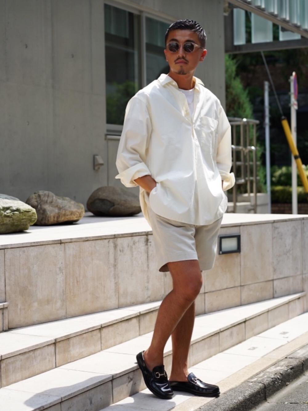 [身長] 178cm [普段サイズ] トップス:LorXL(48) or (50) ボトムス:M(46) or L(48) シューズ:26.5 or 27.0 US8.5 or US9 EU41 [サイズ感] シャツ:ボディーにゆとりがあるシルエット。 ショーツ:丈は膝上でリラックスのあるシルエット シューズ:ハーフサイズからワンサイズ大きめ (個人差あり) [素材感] シャツ:綿100% ショーツ: 綿36% ポリエステル64% [スタイリングポイント] ニュアンスカラーなイエローとベージュを使ったワントーンのスタイリングが気分です。どうしても子供っぽく見えてしまうショーツにも、艶感のあるシャツや足元に革靴を合わせていただくと上品に着こなせます。レザーシューズを合わせるときに、カジュアル感を強めたい際は、シャツのボタンを全て留めずに、胸元の抜け感を出していただくのもおすすめです。