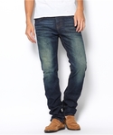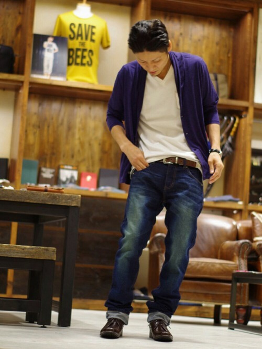 当店限定の特別注文カラーのカーディガン。ネイビーがメインになると、コーディネートの印象も一気に変わります。 デニムはサイジングをわざとあげてあり、武骨なイメージにしました。