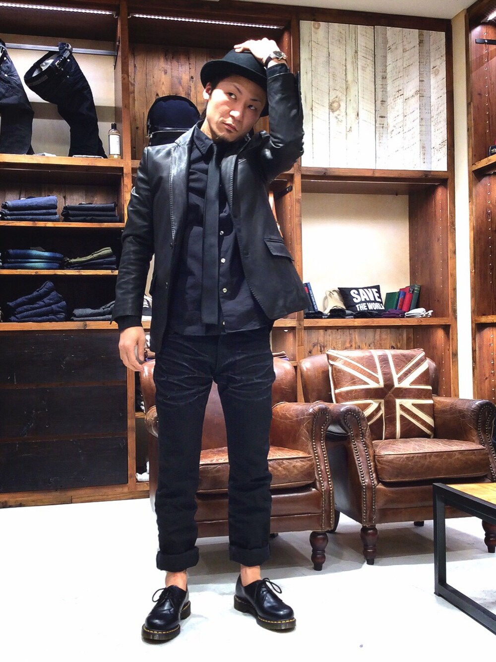 好評いただいているデニムのブラックです。ブルースブラザーズみたいな格好がしたくなりましたw Dr.Martensと特別注文のタイは店頭にて。