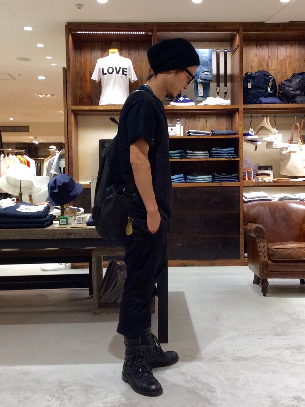 夏真っ盛りの気温になってしまいましたね… ニットキャップで寝癖炸裂の髪型をカバー。メガネで二日酔い満載な瞼をカバーするとそれなりに見えますね笑 パンツはモクロディのスラックスをロールアップしています。 バッグはHAMNETTの人気のレザーリュックの初代デザイン! 未だに現役。長持ちを自分で体現しています笑