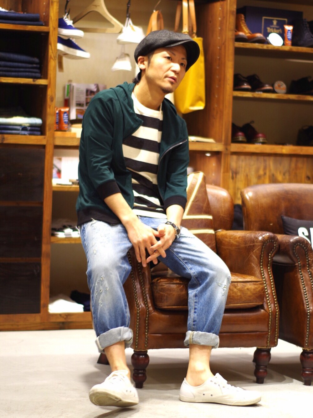 普段は着ない七分丈ですが、着心地、非常にいいです。 ストレッチの非常に効いた素材で、ビリジアングリーンとネイビーがあります。 自分は岩手出身なので、関東の梅雨のじめじめした感じが本当に苦手です。しかし、夜少し寒い、ですとか、自転車乗って遊びに行くとか、山に行楽に、ですとか。 羽織モノが必要なら案外いいかもしれません。 詳細は、店頭にて。 お洗濯楽ちん、アイロンいらずで奥様に迷惑を掛けなくて済む、汚れに強い色使い。 大人コーデって、こういうことか、と