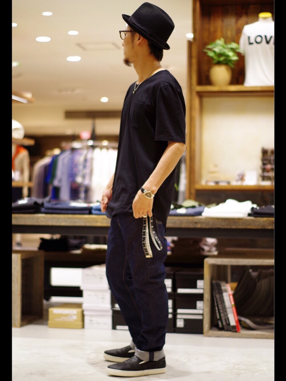 仕事場の一コマですね笑 デニムは以前もあげているLee×KATHARINE HAMNETT LONDONのアイテムです サイズを少しあげてゆるいシルエットを使うのも作業や運動にもってこい、です が、 トップスのサイジングが肝です で、メジャー、 実を言うと当店の売り物を気に入って購入した物で、何とゾゾタウンで完売してました! ハットはやはりこのくらいのショートブリムが好きです 汚れを気にしない、ゆるくもきっちりも着られる、楽ちん 大人コーデって、こういう事かと