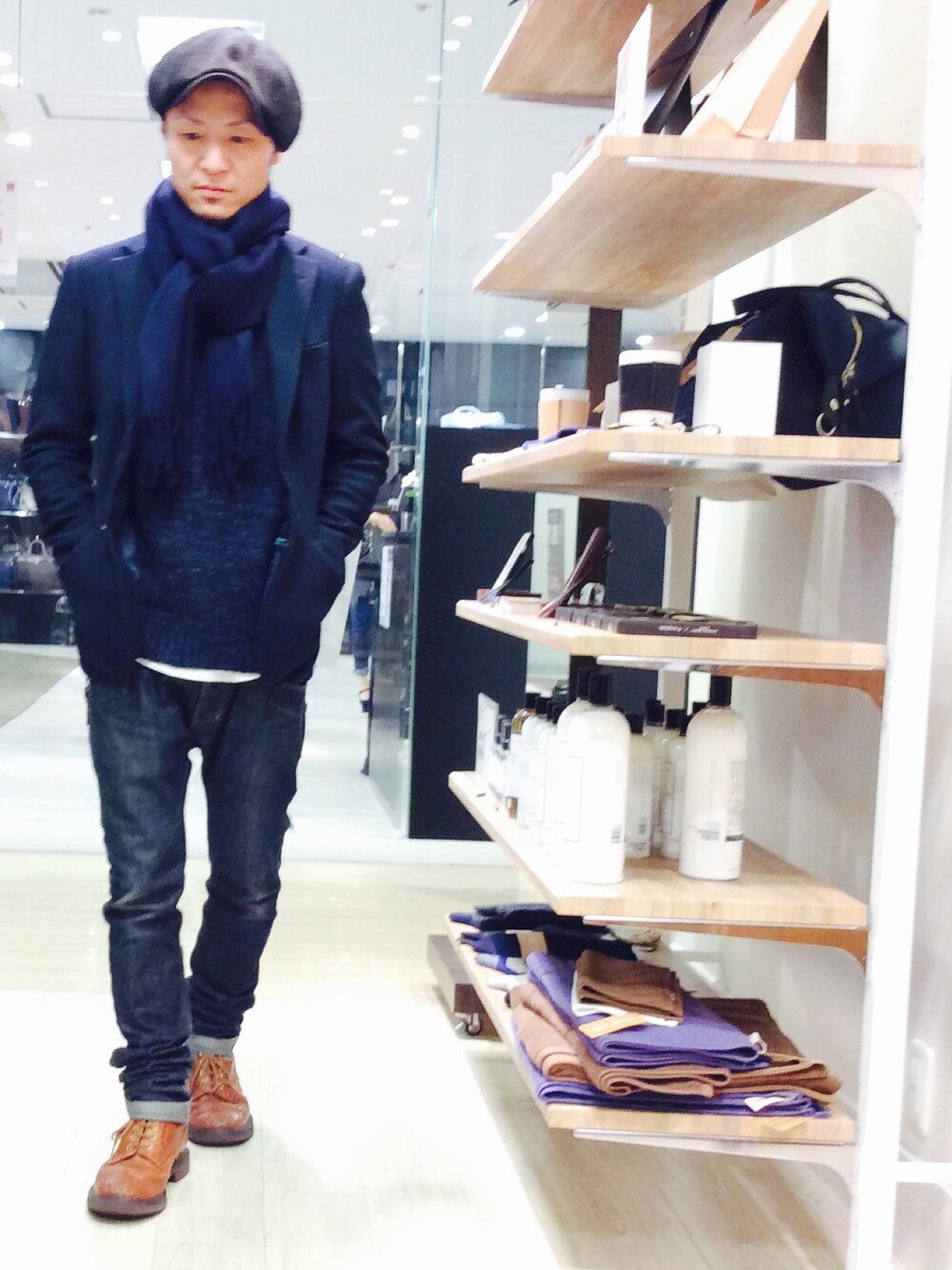 雪降りそうな中でもイケるジャケットスタイルです 大判のカシミアマフラーは、ショール並みの大きさもあって確実に顎まで隠れる素敵なサイズです ジャケットはホームスパン 厚手な生地感はかなりの防寒性 忘年会の多くなる時期、厚手のニットの上に着ていくのは相当の威力を発揮するでしょう