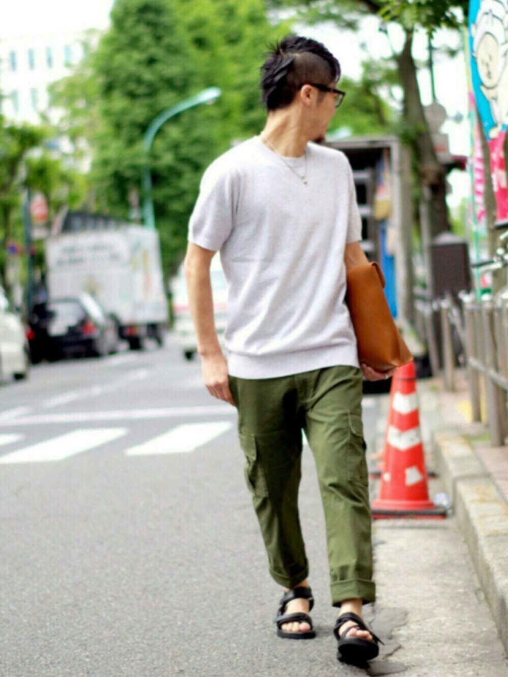 この頃カジュアルではコットンのテーパードパンツから覇権を取り戻しつつある笑、カーゴパンツをメインに据えたコーディネートです 履き丈は短めに、テーパードフォルムをインチアップして少しルーズなシルエットが今のところ気分がハマります トップスはコットンで作った半袖ニット 白ではなく、襟元の汚れが気にならないライトグレーが透けないし丁度いいです ノートPCやタブレットを入れて丁度いいクラッチを持てば、今のトレンドもアメカジをスマートにこなす空気も両方いいとこ取りですね 写真はファイヤー通りの巨匠にお願いしました 休日ランチビールにももってこいの、緩くて楽チン、街中に馴染むソコソコオシャレに見えそうなコーディネート…だと思います笑 後ろ向いてますが、一番自然に街中をイメージ出来る写真だったのが採用理由でして… お許し頂けると幸いです
