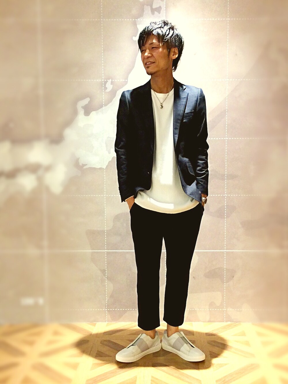 メランジ調に織り上げたコットンのジャケットを着てみました この素材は当ブランドで人気がたかく、今年もサクサクッと出て行きます シルエットが細めで、背筋が伸びる様なフィット感です パンツはジャージ素材。ランニング兼用にこっちを買うことにします セットアップに見えなくも無いですね