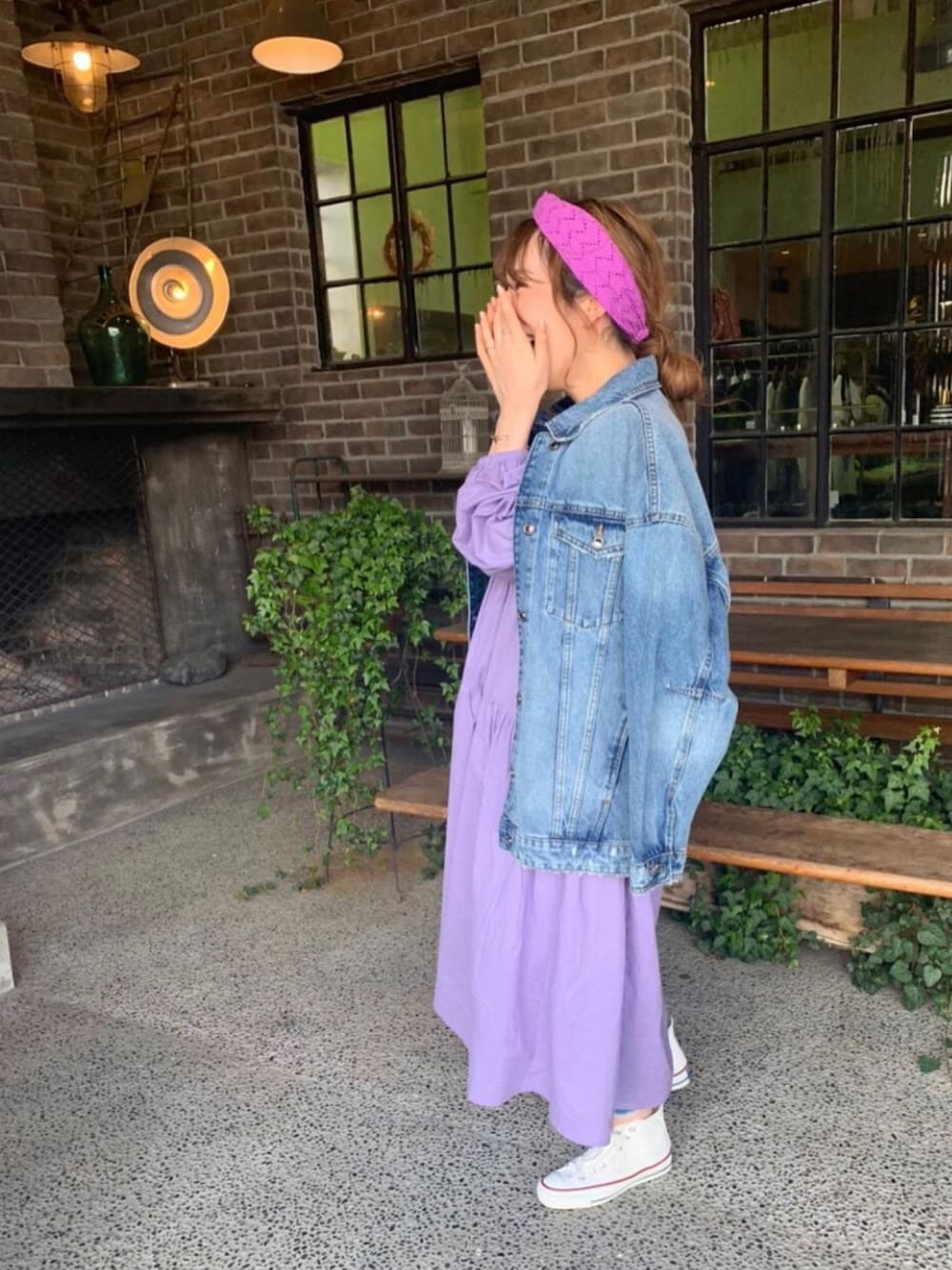 地元で購入したパープルのワンピースを主役に。