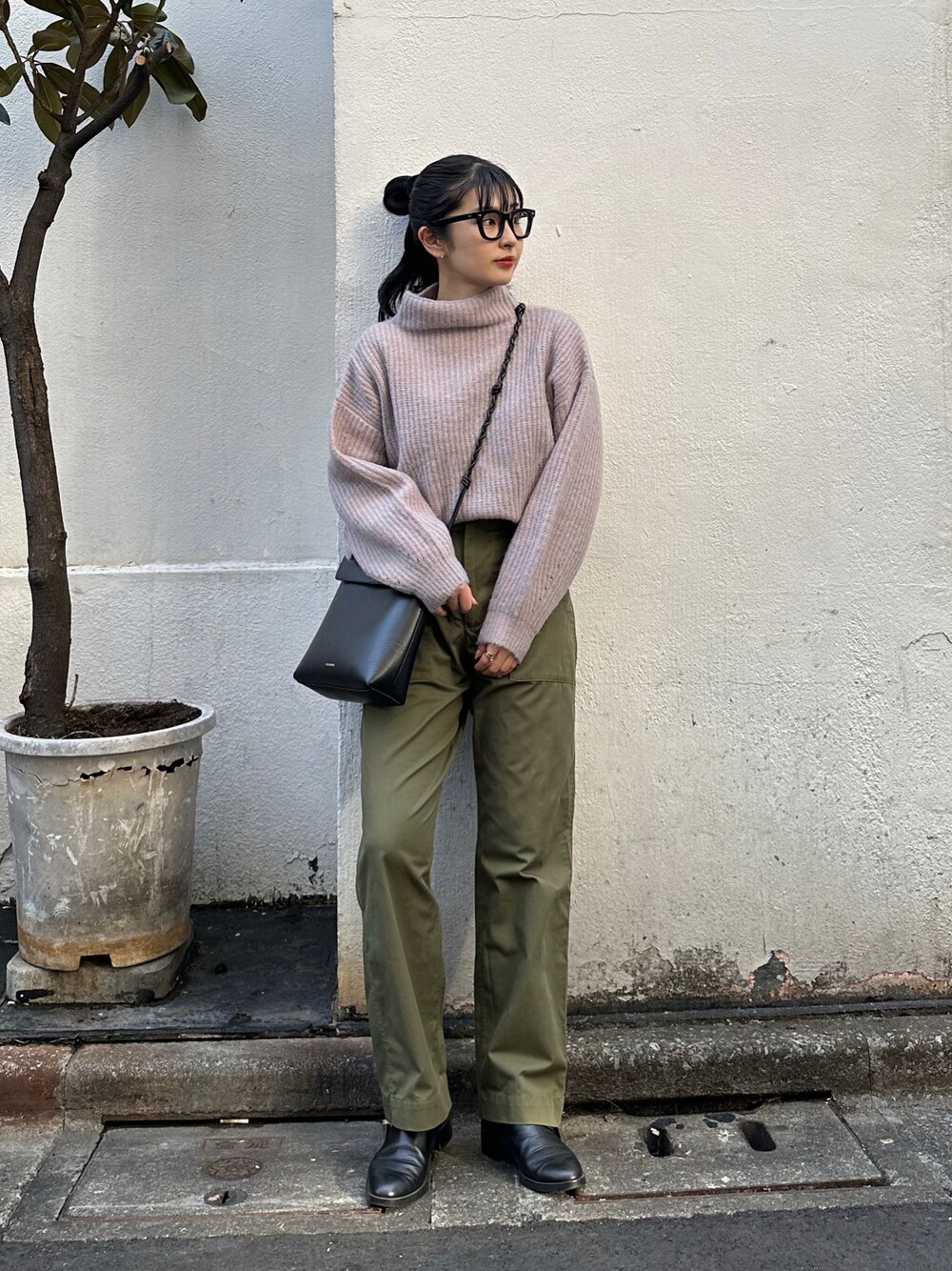色味が絶妙なニット🧶🫐 ぽわんとした袖も愛らしいシルエットです🤝🏻 ミリタリーパンツで合わせてカジュアルなコーデにしてみました🫡