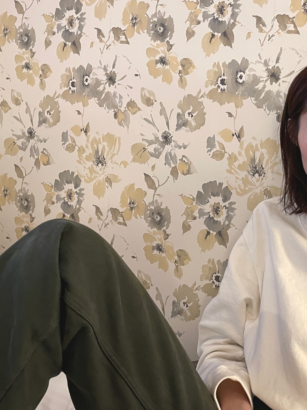 グリーン系のデニムパンツ、ホワイト系のスウェットを着用したレディースの冬コーディネートの1枚目の写真
